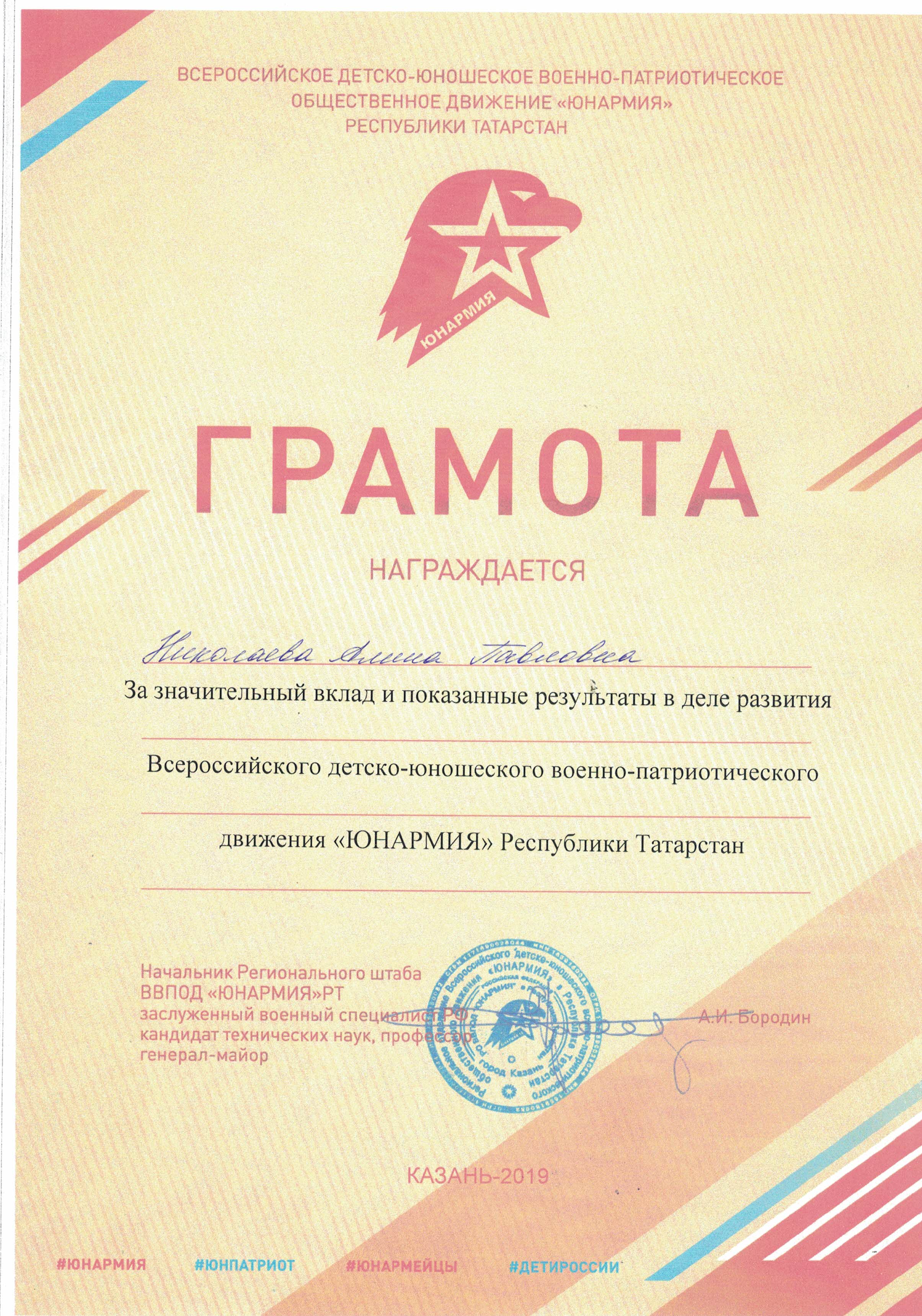 Грамотой за значительный вклад и показанные результаты в деле развития Всероссийского военно-патриотического общественного движения «ЮНАРМИЯ» Республики Татарстан были награждены