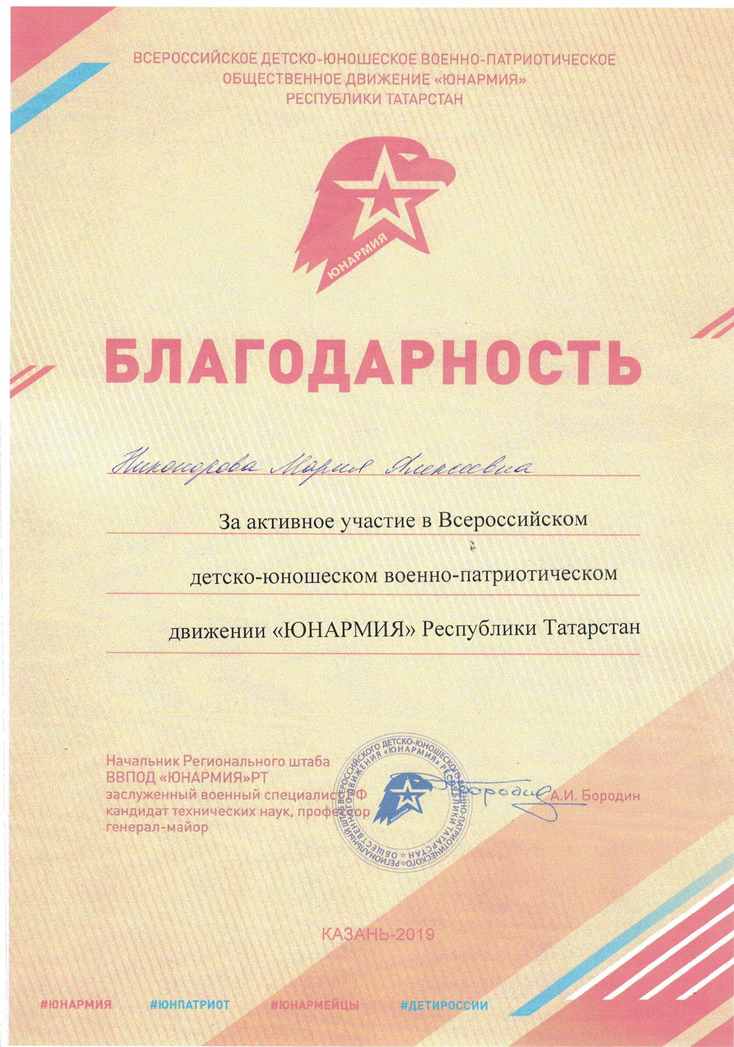 Благодарностью за активное участие во Всероссийском детско-юношеском военно-патриотическом движении «ЮНАРМИЯ» Республики Татарстан были награждены: