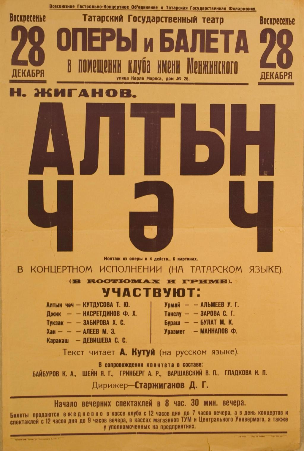 Фото №44919. Афиша спектакля Н.Жиганова "Алтын чәч" Татарского театра оперы и балета. 28 декабря 1941