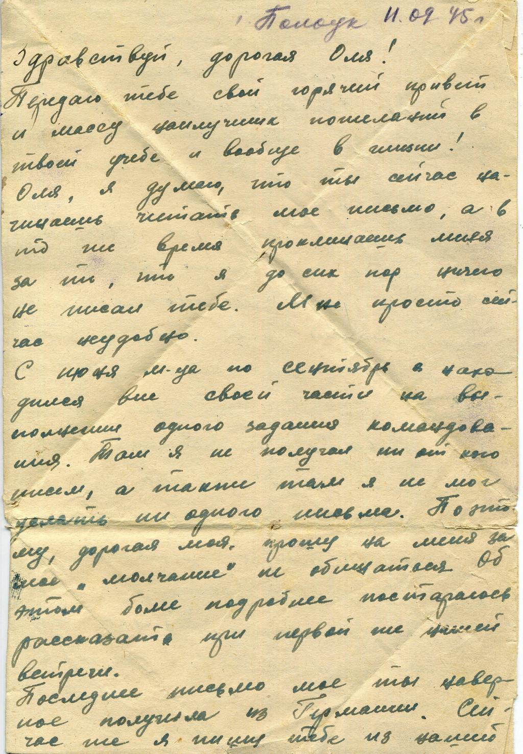 Фото №45238. Письмо-треугольник Егоровой Ольге Григорьевне от Яверпута. 11.09.1945 (стр.2-3)
