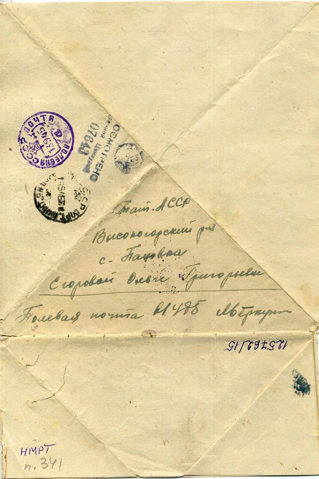 Фото №45242. Письмо-треугольник Егоровой Ольге Григорьевне от Яверпута. 11.09.1945 Книги