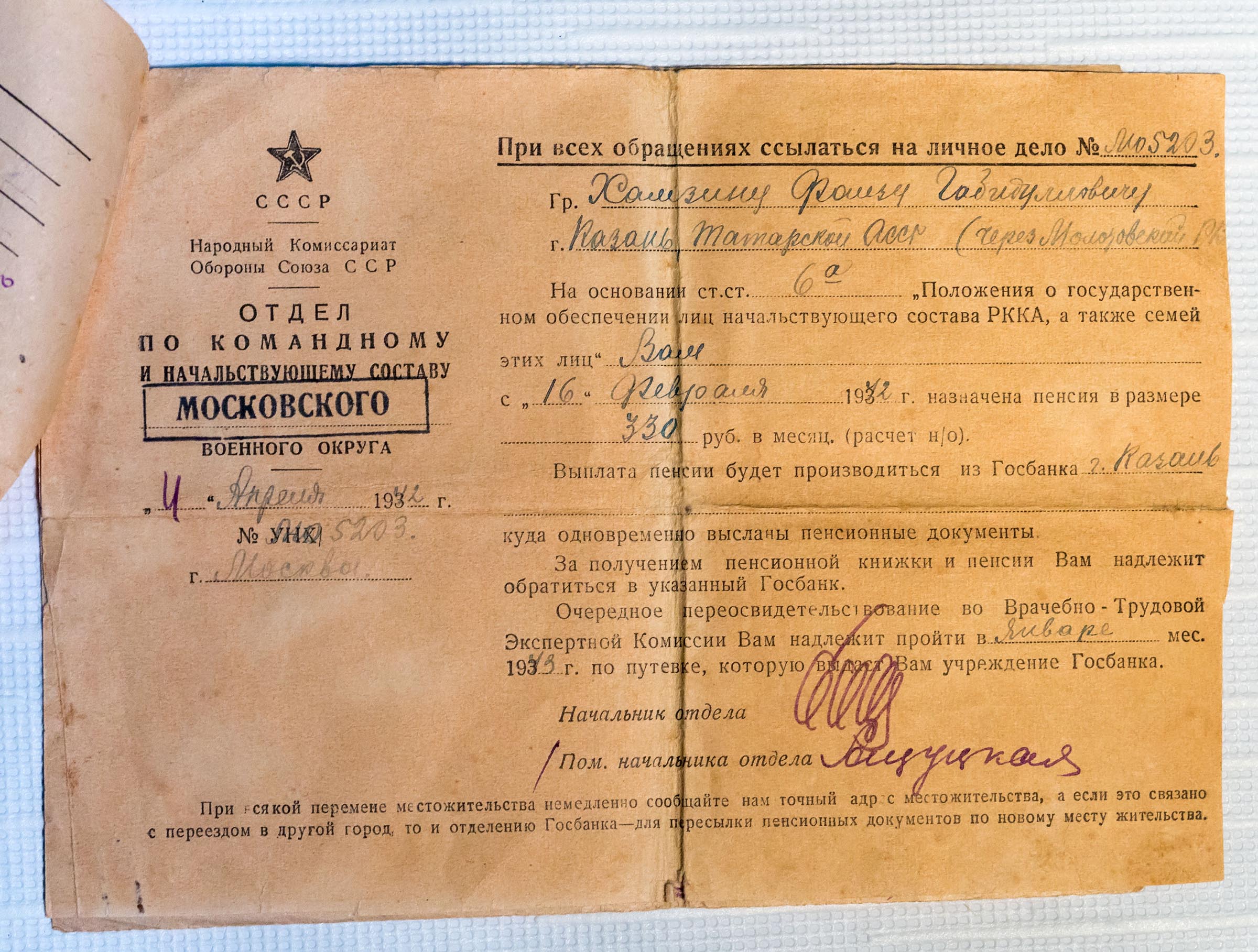 Фото №16018. Удостоверение Хамзина Ф.Г. о назначении пенсии после ранения. 1942