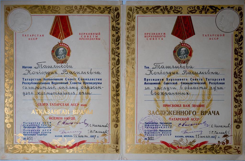 Фото №33964. Почетная грамота о присвоении звании «Заслуженного врача Татарской АССР» Ташлыковой К.В. Казань. 13 июля 1957 года