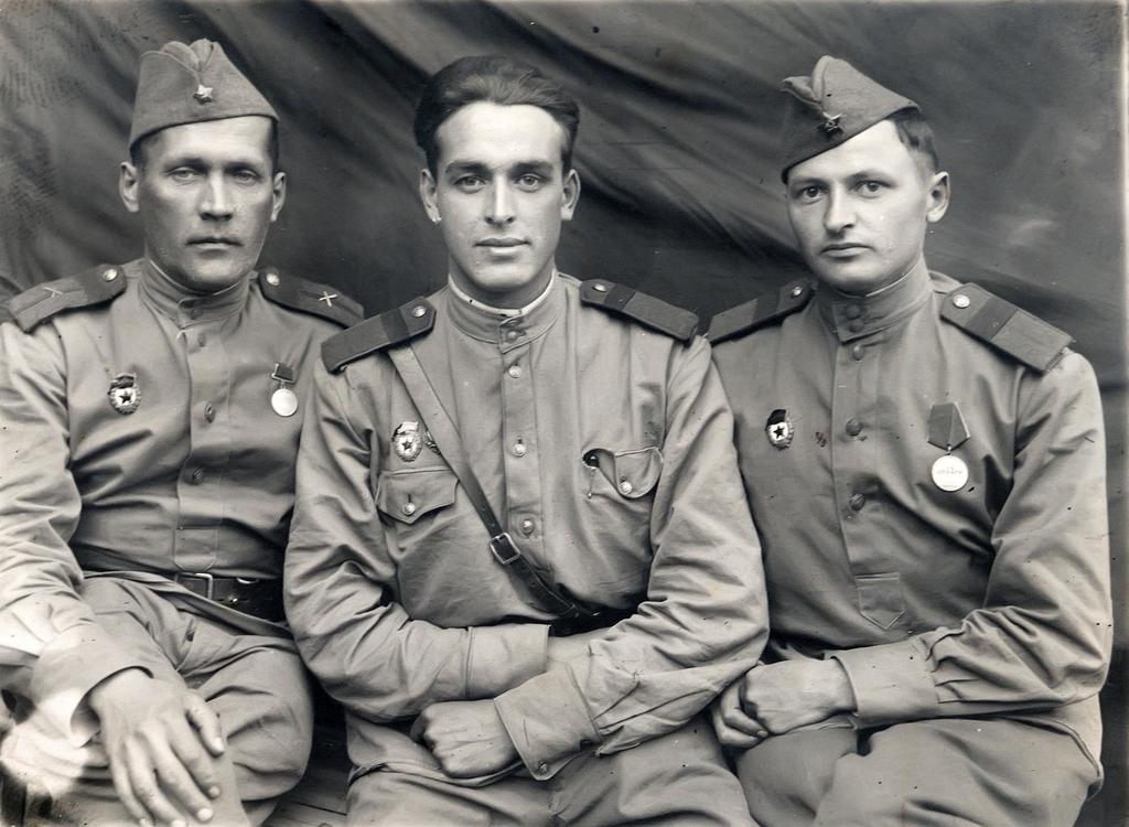 Фото №34028. Фото. Музафаров Б.Х. (в центре) - участник Великой Отечественной войны с боевыми товарищами Кашурниковым и Ивановым. 1945Принадлежало Б.Х. Музафарову - участнику Великой Отечественной войны.