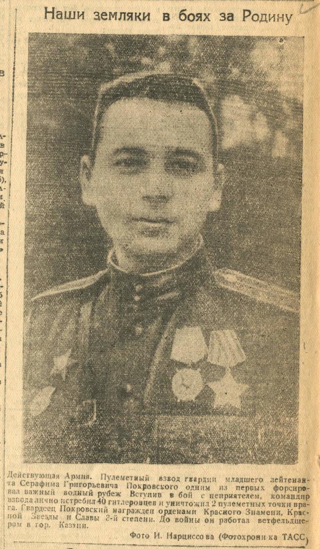 /О подвиге при форсировании водного рубежа младшего лейтенанта Серафима Григорьевича Покровского, до войны ветеринарного фельдшера г.Казани.- Газета «Красная Татария». – 7 января 1945 г. (№5)