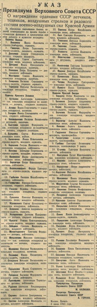 «О награждении орденами СССР летчиков, техников, воздушных стрелков и рядового состава военно-воздушных сил Красной Армии». - Газета «Красная Татария». – 10 июля 1941 г. (№160) 10.07.1941 - №160