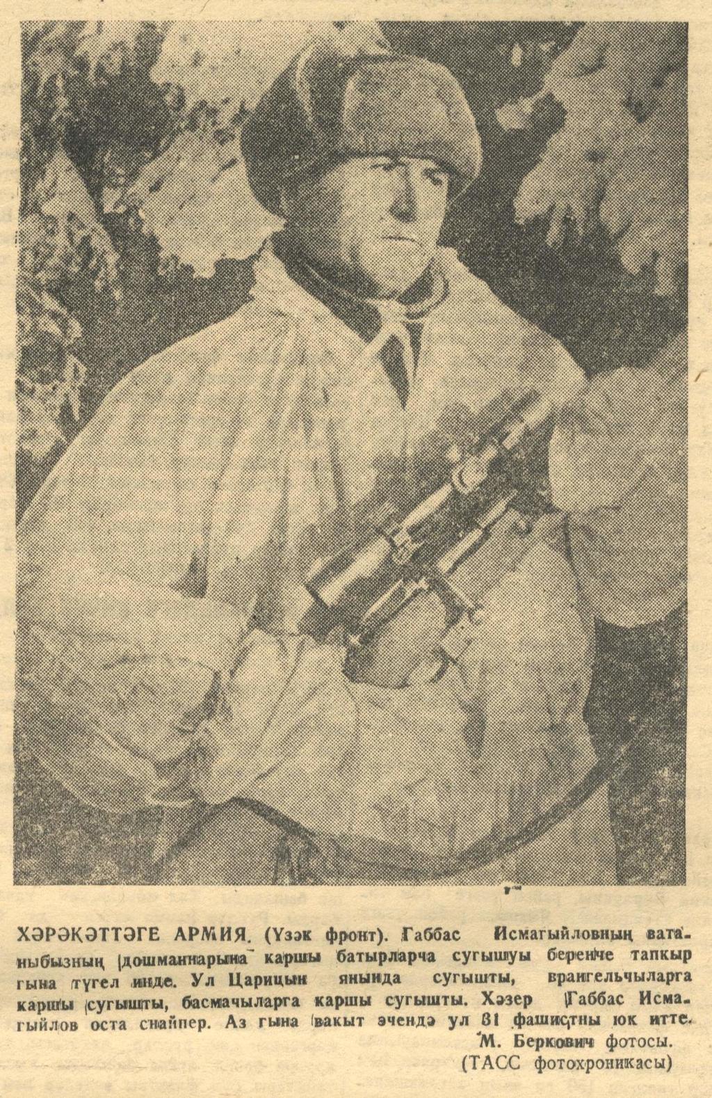 Заметка “С действующей армии (Центральный фронт)./ О снайпере Габбасе Исмагилове.- Газета “Кызыл Татарстан”.- 6 февраля 1943 г. (№30)
