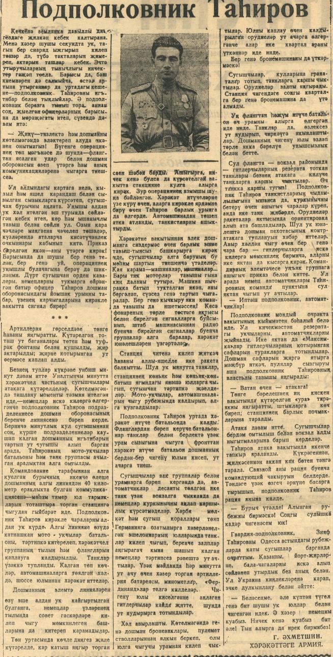 Статья. “Подполковник Тагиров”.- Газета “Кызыл Татарстан”. 19 мая 1943 г. (№193) 16.05.1944 - №193