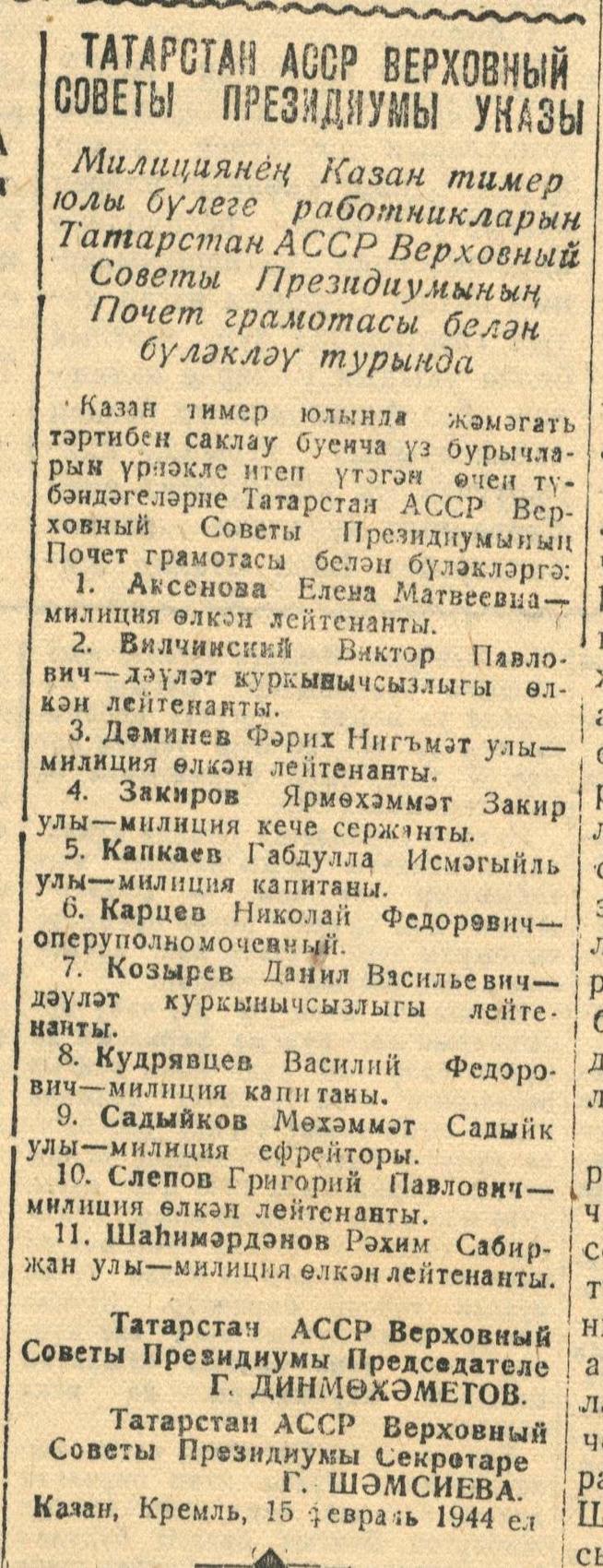 “Милициянең Казан тимер юлы бүлеге работникларын Татарстан АССР Верховный Советы Президиумының Почет грамотасы белән бүләкләнү турында”. - Газета “Кызыл Татарстан” . - 26 февраль 1944 ел. (№40)