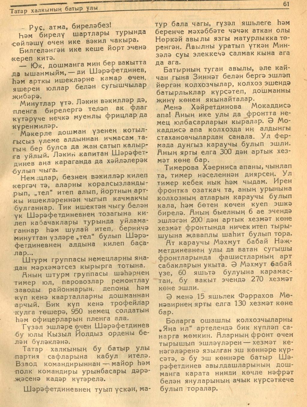 Мәкәлә.С.Ураиский. “Татар халыкның батыр улы Зиннәт Шәрәфетдинев”. - Журнал “Совет әдәбияте”.- 1943 (№7).-58-61 бб.