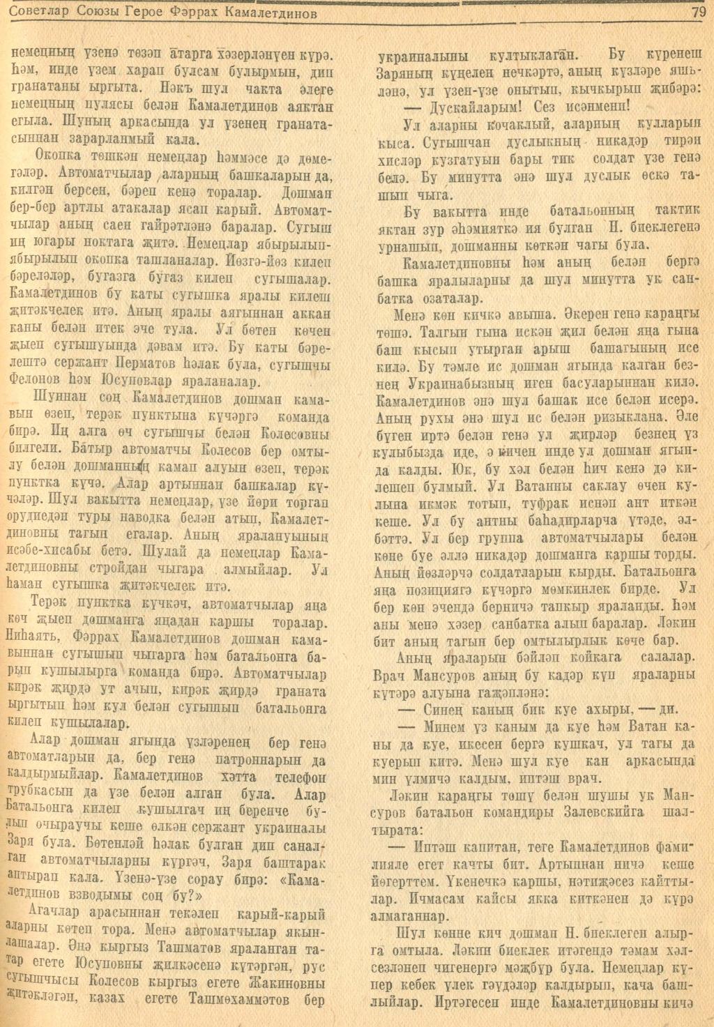 Мәкәлә. Г.Галеев. “Советлар Союзы Герое Фәррах Камалетдинов”. - Журнал “Совет әдәбияте”.- 1944 (№2-3).-77-80 бб.