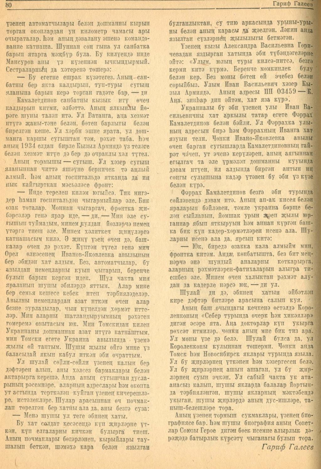 Мәкәлә. Г.Галеев. “Советлар Союзы Герое Фәррах Камалетдинов”. - Журнал “Совет әдәбияте”.- 1944 (№2-3).-77-80 бб.