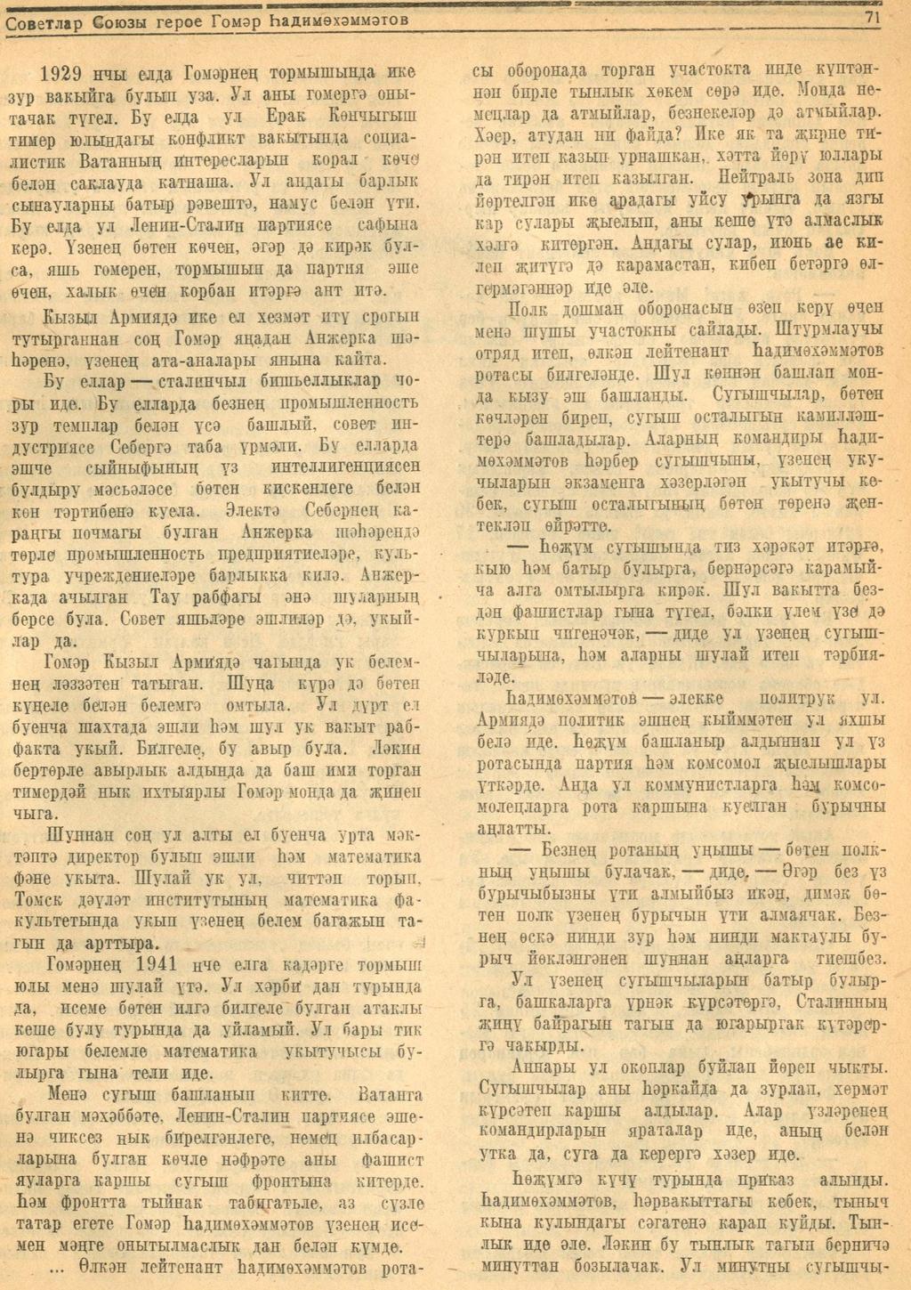 Мәкәлә.Майор М.Гыймадиев. “Советлар Союзы Герое Гомәр Һадимөхәммәтов. - Журнал “Совет әдәбияте”.- 1945 (№1).-70-72 бб.