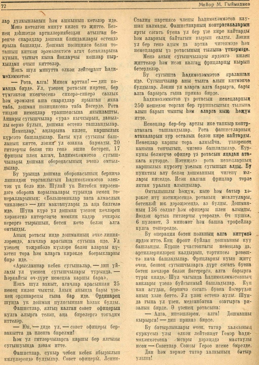 Мәкәлә.Майор М.Гыймадиев. “Советлар Союзы Герое Гомәр Һадимөхәммәтов. - Журнал “Совет әдәбияте”.- 1945 (№1).-70-72 бб.