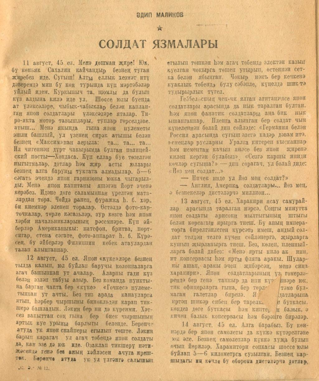 Мәкәлә. Әдип Маликов. “Солдат язмалары”. - - Журнал “Совет әдәбияте”.- 1945 (№12).-45-47 бб.