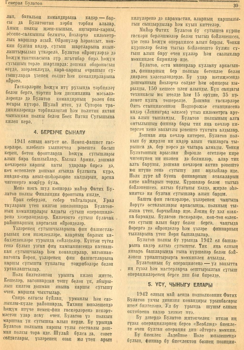 Очерк. А.Сәли-Ураллы. “Генерал Булатов”. – Журнал “Совет әдәбияте”.- 1945 (№6).-37-42 бб.