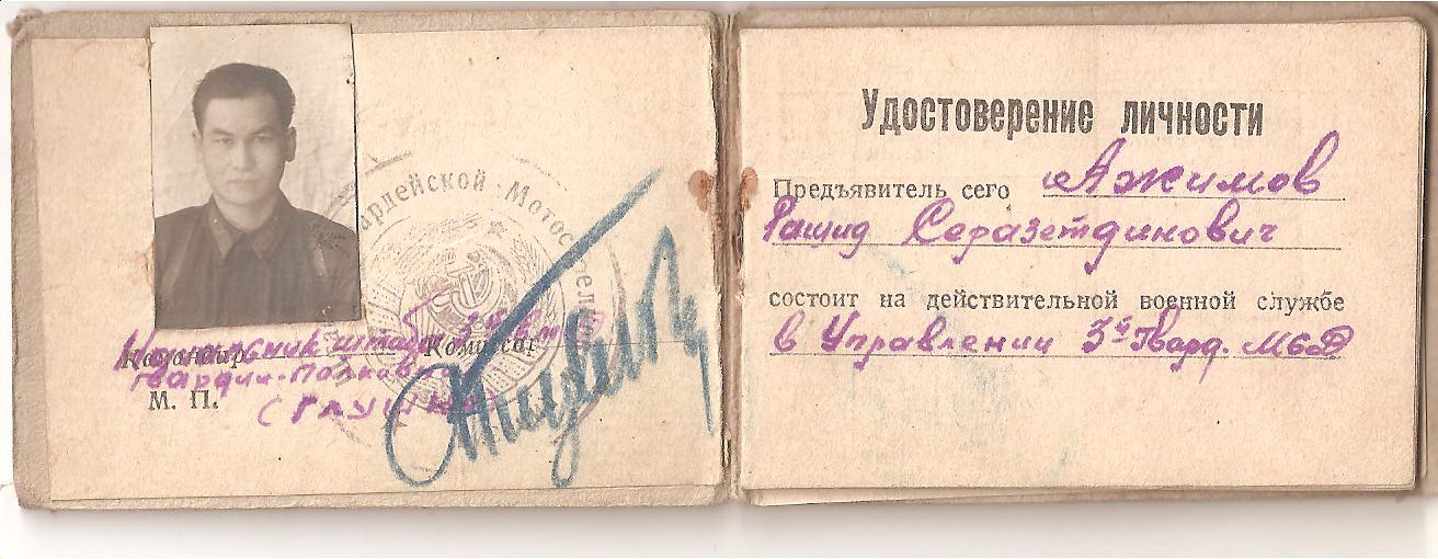 Удостоверение личности Ажимова Р.С. о службе в Управлении 3-ей гвардейской мотострелковой дивизии.
