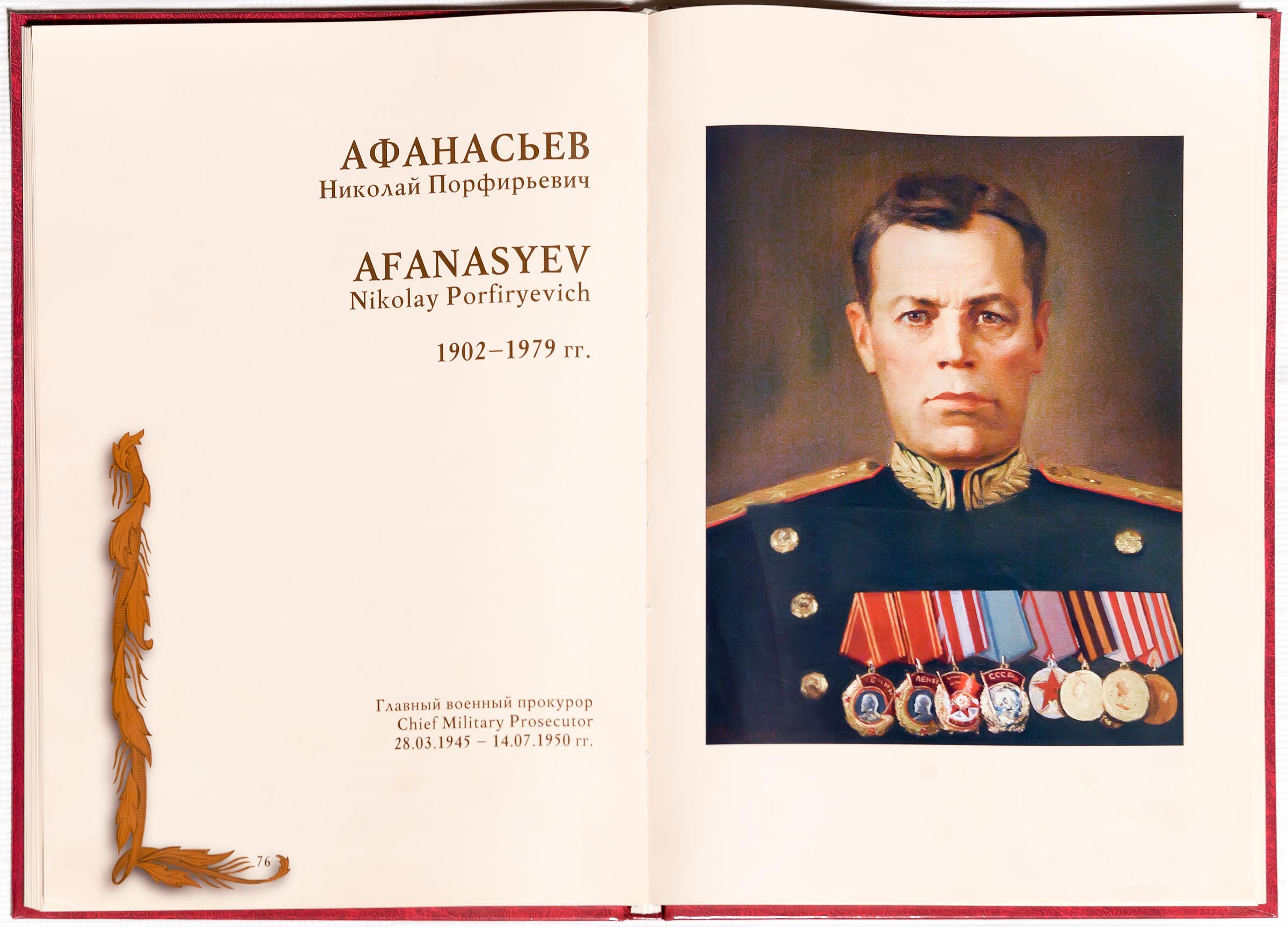 Николай Порфирьевич Афанасьев (1902 – 1979 ) в марте 1945 года был назначен Главным военным прокурором Советской Армии. Это человек с яркой судьбой. В годы Гражданской войны воевал с белочехами, после ее окончания руководил уголовным розыском г. Мамадыш Татарской АССР. С 1924 года – в органах военной юстиции. Начав службу следователем военного трибунала стрелковой дивизии, Афанасьев в ноябре 1939 года стал заместителем Главного военного прокурора. С первых дней войны – полномочный представитель Прокуратуры СССР в Москве. С именем Афанасьева связаны образование и организация деятельности Главной военной прокуратуры железнодорожного транспорта, которую он возглавлял с 1942 по март 1945 года.