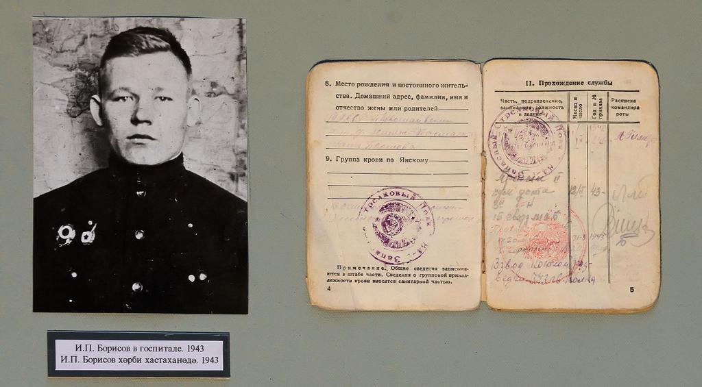 Фото и красноармейская книжка Борисова И.П.- участника Великой отечественной войны. 1943 Борисов Иван Павлович (25 августа 1924 - 7 апреля 2000 ). Родился в деревне Новая-Елань Актанышского района ТАССР. В рядах Красной Армии служил командиром взвода разведки с августа 1942 года по апрель 1944 года. Участвовал в боях на Калининском, 2-ом Белорусском фронтах в качестве разведчика. Был трижды тяжело ранен, вследствие чего демобилизован (инвалид Великой Отечественной войны II группы). Награды: орден Отечественной войны II степени; медали: «За победу над Германией в Великой Отечественной войне 1941-1945 годов», «50 лет Вооруженных Сил СССР».