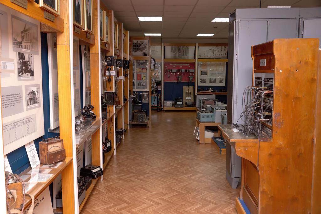 Фрагмент экспозиции с коммутатором телефонной связи и аппаратами телеграфистов. 1920-50-е