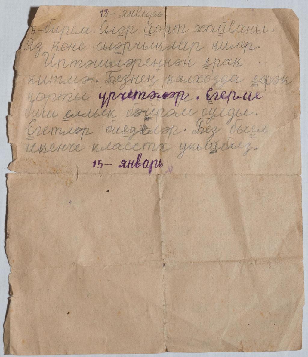 с просьбой о помощи семье погибшего на фронте односельчанина, в которой 4 детей, условия жизни тяжёлые и для дальнейшего обучения детей нет возможностей.Доку мент написан 15 января 1947 г. детским почерком. На оборотной стороне листа простым карандашом написано упражнение по татарскому языку.