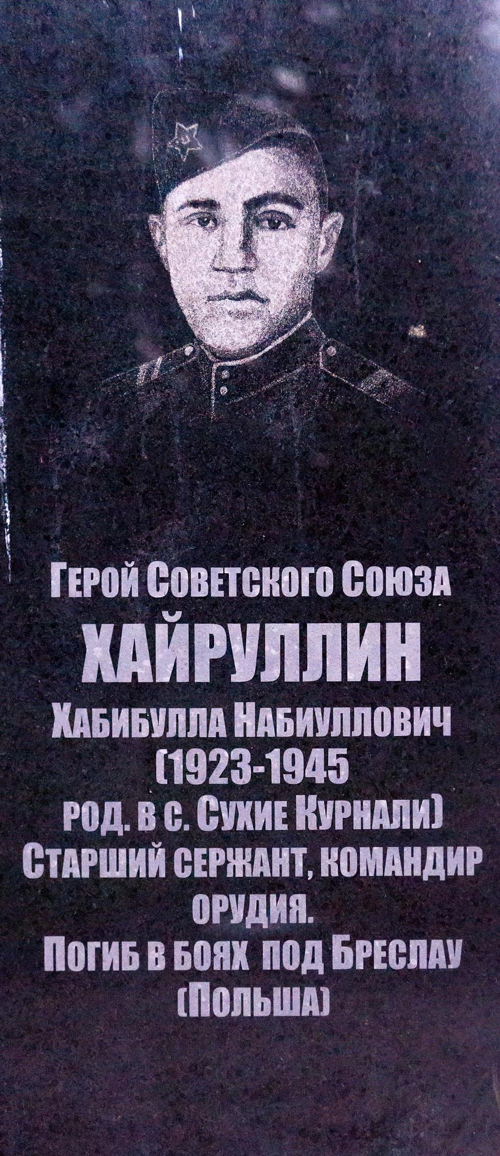 Хайруллин Хабибулла Набиуллович родился в 1923 году в селе Сухие Курнали ныне Алексеевского районы Республики Татарстан. Призван Алексеевским РВК в декабре 1941 году. На фронте – с 1942 года. (Донской, 1-й, 3-й Украинский фронты). Старший сержант, командир орудия 1248-го истребительно-противотанкового артиллерийского полка. Контужен. На плацдарме за Одером, южнее города Сцинава (Польша) 7 февраля 1945 года подавил огонь двух орудий противника и нанес ему большой урон в живой силе. Занимаемый рубеж был удержан до подхода стрелковых подразделений, несмотря на многочисленные атаки противника. Погиб в боях под г.Бреслау (Вроцлав, Польша) 22 февраля 1945 года. Звание Героя присвоено 10 апреля 1945 года посмертно.