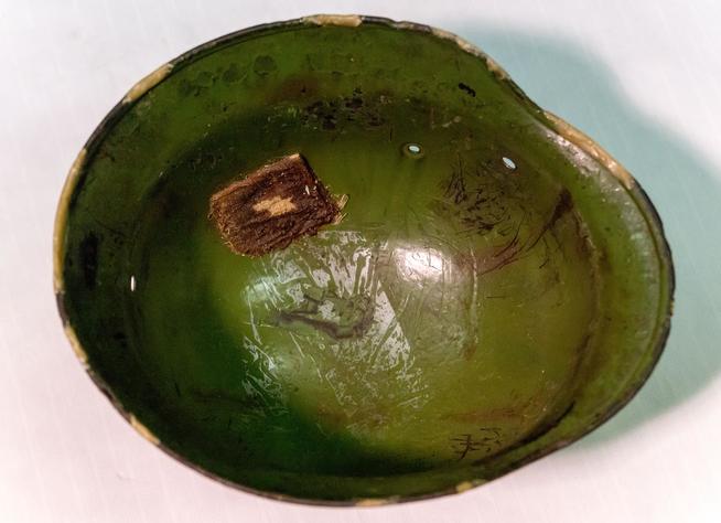 На каску нанесена декаль - знак немецкого Вермахта - золотой орел.