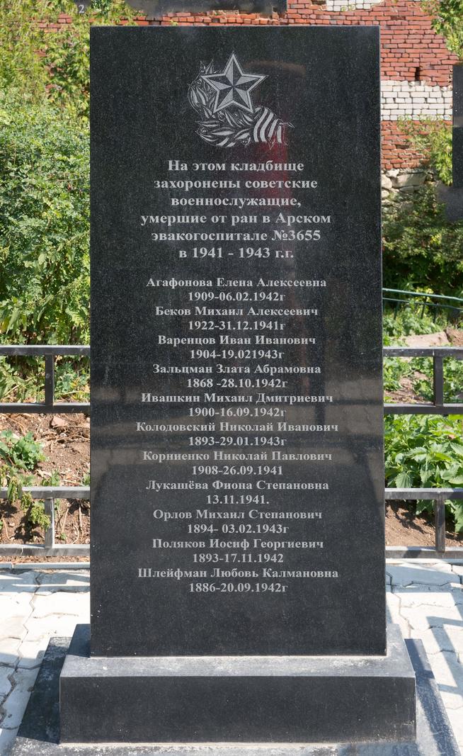 Надпись на плите: "На этом кладбище захоронены советские военнослужащие, умершие от ран в Арском эвакогоспитале №3655 в 1941-1943 гг.