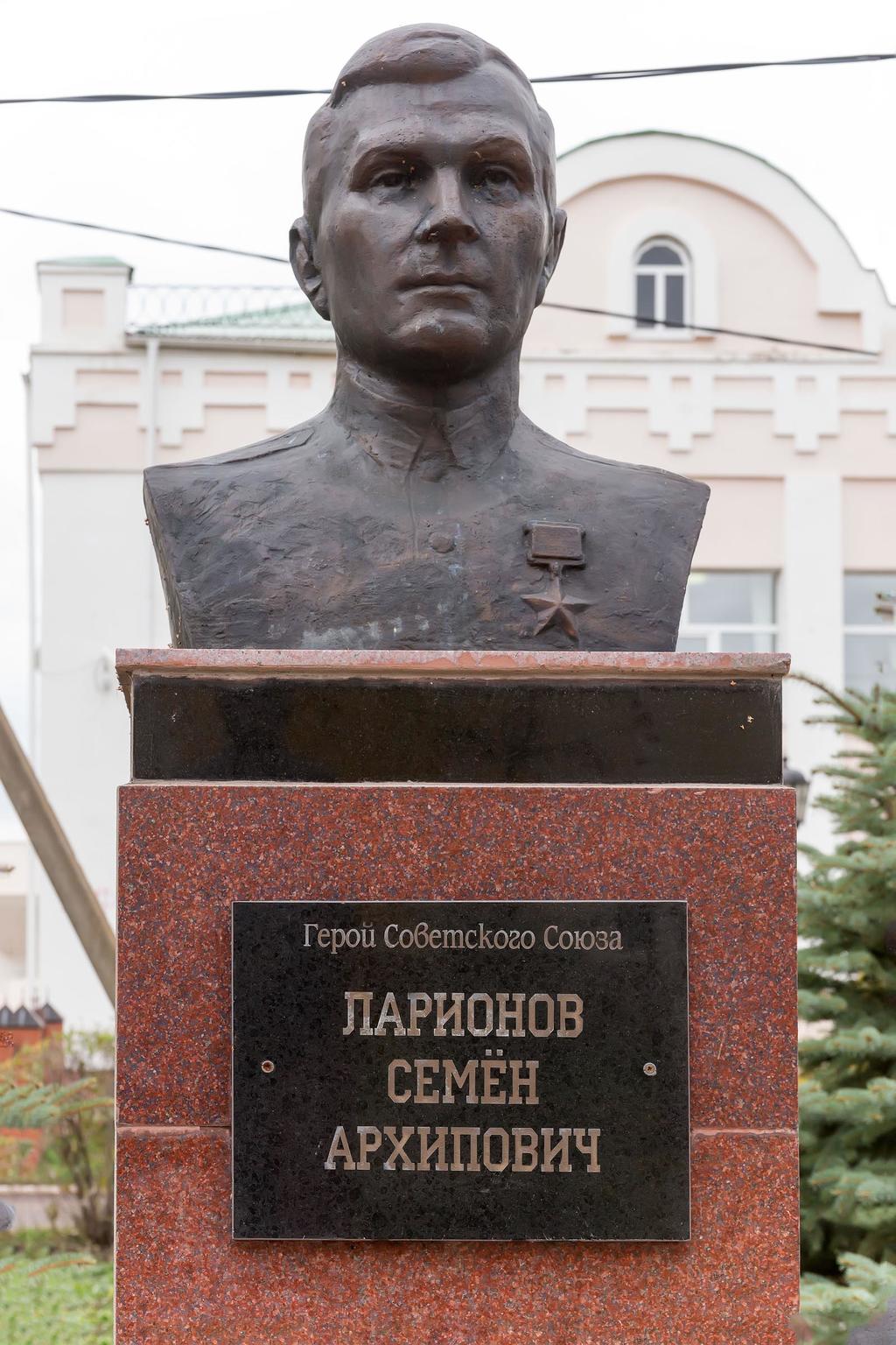 ЛАРИОНОВ Семён Архипович (1.4.1915, село Черемшан Бугульминского уезда Самарской губернии — 29.12.1984, село Мерке Меркенского района Джамбульской области Казахской ССР), Герой Советского Союза (30.10.1943), старший лейтенант. Окончил Курсы младших лейтенантов (1944), партийную школу при ЦК КП Казахстана (1949). Работал в Ново-Ивановской МТС (Свердловский район Джамбульской области). В Красной Армии в 1937-39 и с декабря 1941. На фронтах Великой Отечественной войны с апреля 1942, командир огневого взвода истребительно-противотанковой батареи 237-го стрелкового полка (69-я стрелковая дивизия 65-й армии). В составе войск Донского, Центрального, 1-го и 2-го Белорусских фронтов принимал участие в Сталинградской (1942-43) и Курской (1943) битвах, в Черниговско-Припятской, Гомельско-Речицкой (обе — 1943), Белорусской (1944), Восточно-Прусской и Берлинской (обе — 1945) наступательных операциях. Проявил героизм при форсировании реки Днепр у поселка Радуль (Репкинский район Черниговской области) 16 октября 1943: в составе штурмовой группы с орудиями и расчётами преодолел реку, участвовал в захвате и расширении плацдарма. С 1946 в запасе. До 1974 на партийной работе в селе Мерке.