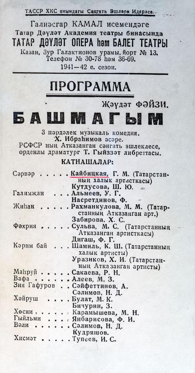 Программа спектакля "Башмагым" (Башмачки) по либретто Т. Гиззата. Казань. 1941-1942-е годы