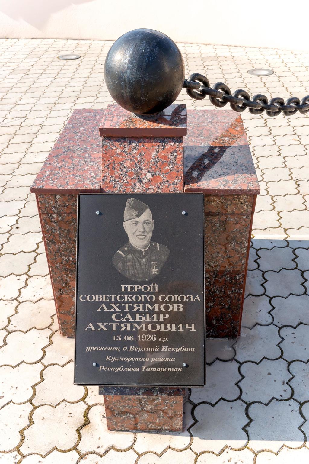 АХТЯМОВ Сабир Ахтямович (1926-2014), уроженец деревни Верхний Искубаш, ныне Кукморского района. В Красной Армии с ноября 1943 года. На фронтах Великой Отечественной войны с мая 1944 года, наводчик противотанкового ружья 4-й гвардии мотострелковой бригады (2-й гвардейский танковый корпус 11-й гвардейской армии). В составе войск 3-го Белорусского фронта участвовал в боях за освобождение Белоруссии, Литвы, Вост. Пруссии. В октябре 1944 года проявил героизм при штурме населенного пункта Неммерсдорф (ныне село Маяковское Калининградской области). Герой Советского Союза (24.3.1945). Участник Парадов Победы в Москве (24.6.1945, 9.5.1995). После войны на командных должностях в Советской Армии. Окончил Высший военный институт КГБ (1959). С 1972 года в запасе, окончил службу в звании полковника. Проживал в Казани. Похоронен в Кукморе.