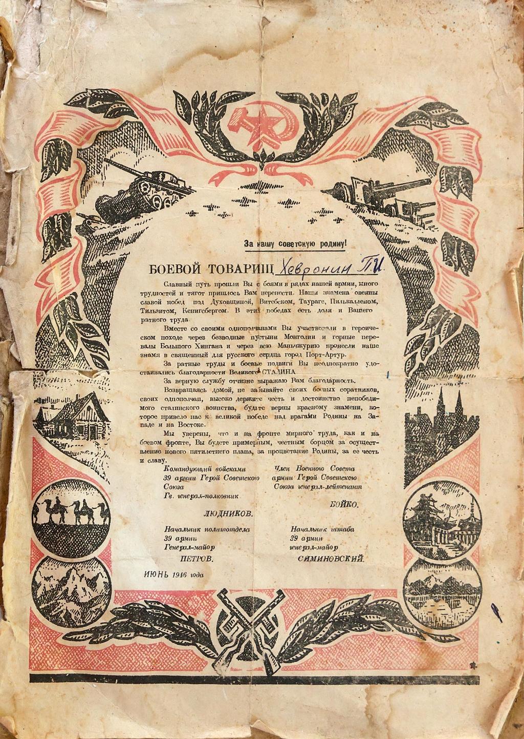 Грамота от имени Верховного Главнокомандующего И.В. Сталина. Передана в музей женой Хевронина П.И. в 1976 году.