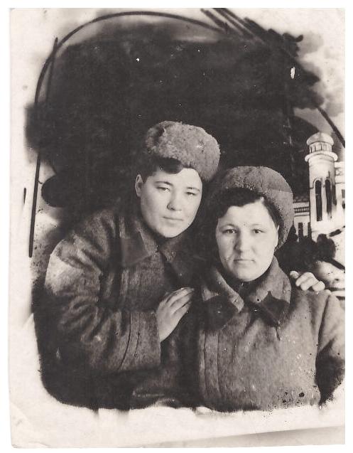 Слева-направо: 1) Казакова (Кривова) Пелагея Васильевна, уроженка с.Новый Мелькен Мензелинского р-на (1943 г.р.), мобилизована в 1942 г., рядовая, 379 зенитно-артиллерийская дивизия, наводчица пушки, демобилизована в 1945 г. 2) Каменьщикова Клавдия.