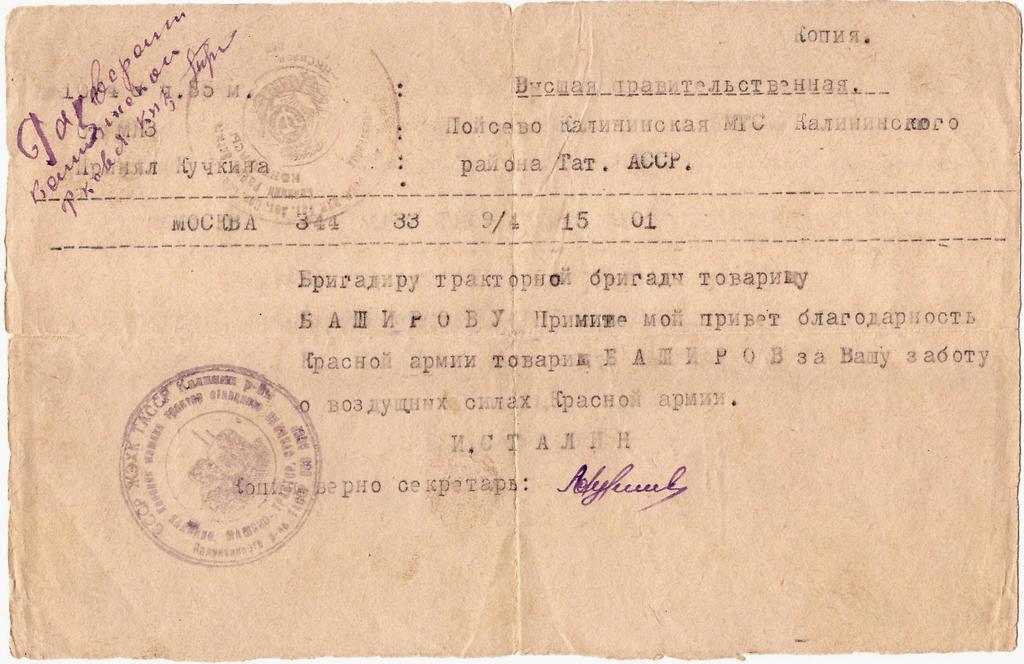 Благодарность высшая правительственная бригадиру тракторной бригады Баширову от Сталина И.
