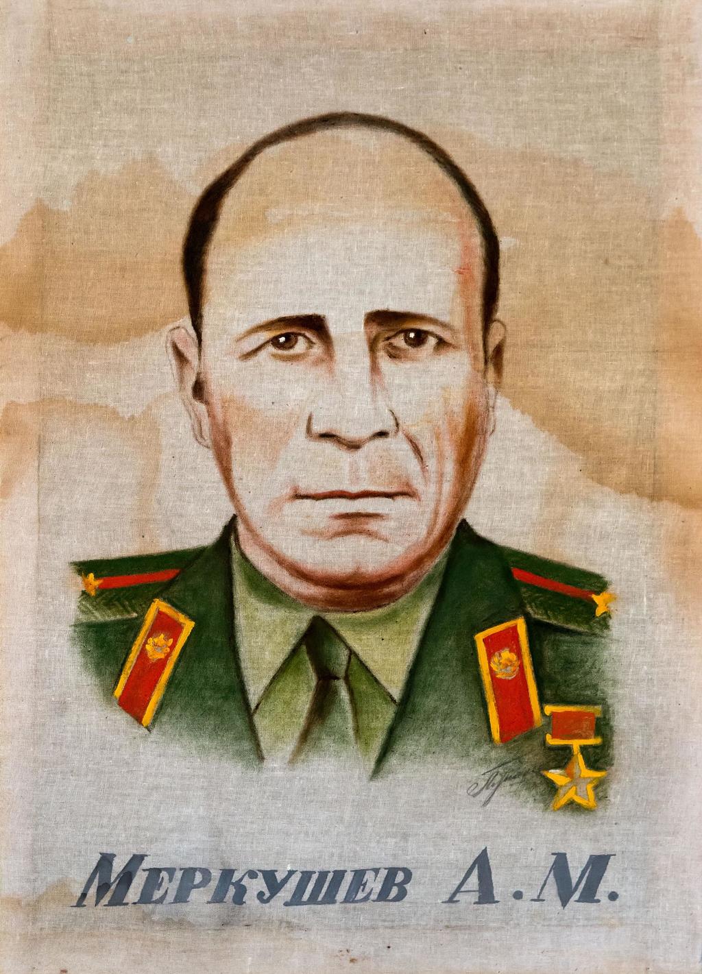 Картина. Меркушев А.М. (1918-1986) - Герой Советского Союза. Рыбно-Слободский район. 1985. Холст, акварель