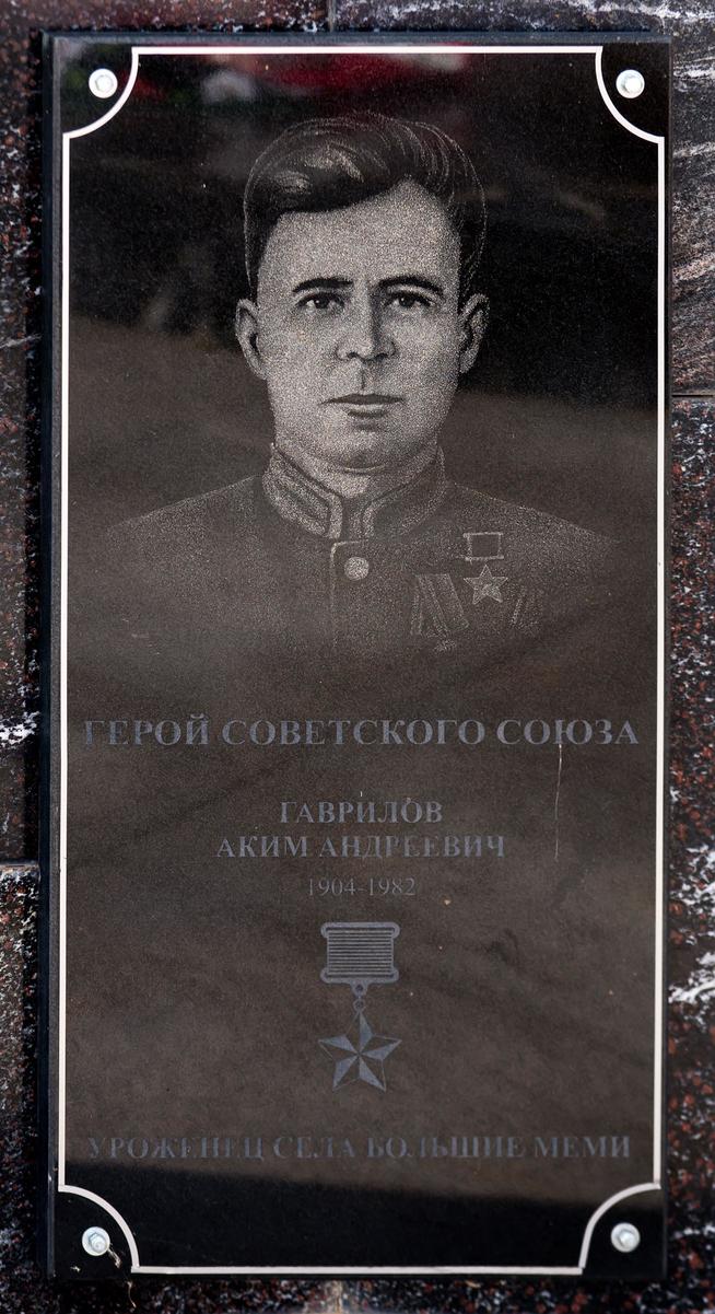 ГАВРИЛОВ Аким Андреевич (22.9.1904, село Большие Меми Свияжского уезда Казанской губернии — 22.1.1982, Елабуга), Герой Советского Союза (13.9.1944), гвардии младший лейтенант. Окончил Казанское танковое училище (1943). Работал на шахте в Донбассе (1921-26), в родном колхозе (1926-33), на профсоюз. работе в совхозе имени Разумова (ныне совхоз "Мамадышский") (1936), управлял базой завода "Красный Восток" в городе Агрыз (1938-39), работал в артели "Ударник" и Управлении связи в Елабуге (1940-42). В Красной Армии с июля 1942. На фронтах Великой Отечественной войны с 1943, командир взвода 136-го гвардейского стрелкового полка (42-я гвардейская стрелковая дивизия, 40-я армия). В 1943 в составе войск Воронежского и 1-го Украинского фронтов принимал участие в Курской и Полтавской битвах, боях за освобождение Сумской области. Проявил героизм при форсировании реки Горный Тикич в районе села Антоновка Маньковского района Черкасской области 6марта 1944: первым бросился в ледяную воду, увлекая личный состав взвода; преодолев водный рубеж, взвод закрепился и продолжил бой по удержанию и расширению плацдарма. Гаврилов был тяжело ранен. В 1944-45 председатель сельсовета села Разживино Елабужского района. В 1946-57 заведующий отделом социального обеспечения райисполкома, уполномоченный Министерства по заготовкам ТАССР, заместитель председателя исполкома Елабужского горсовета.