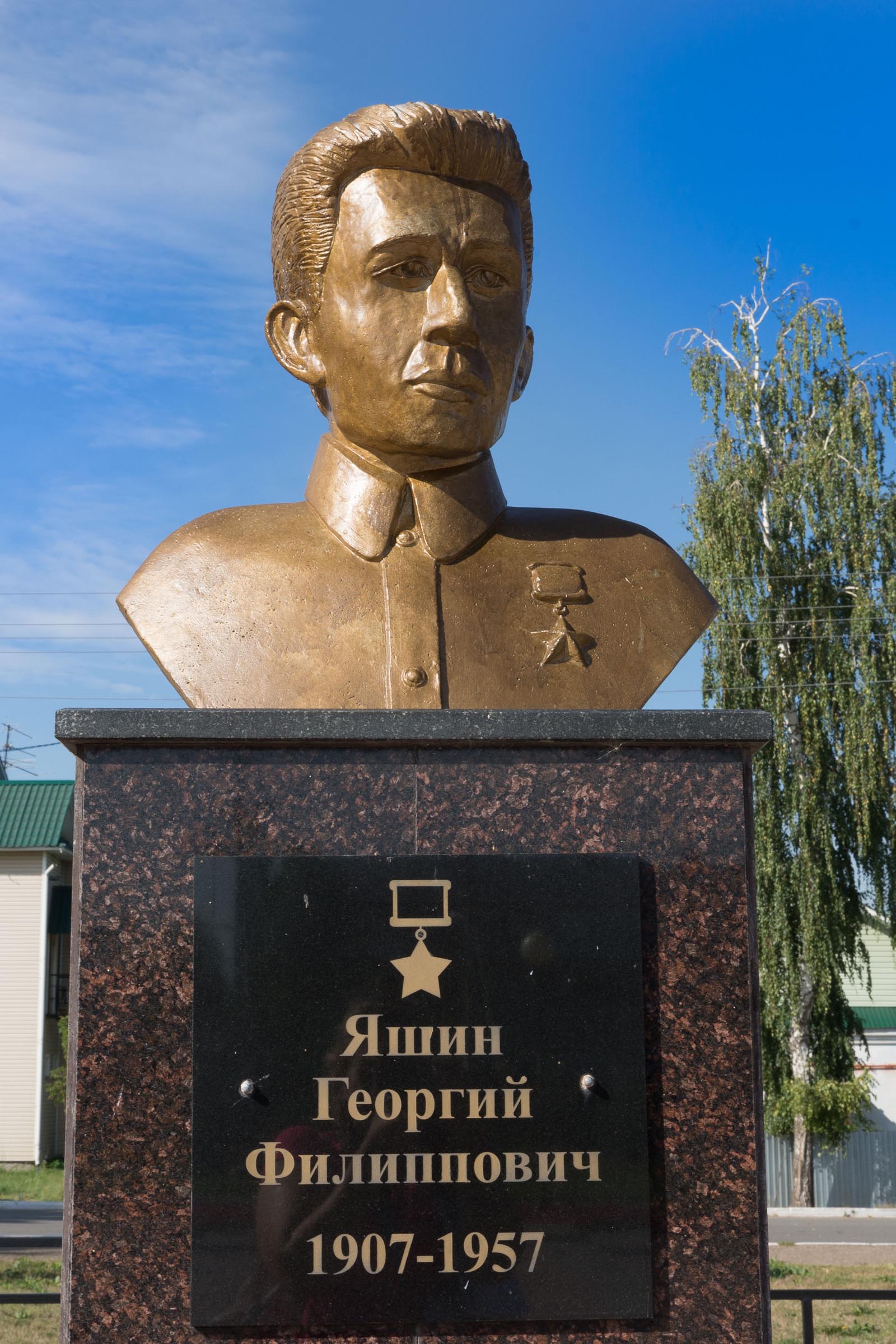 ЯШИН Георгий Филиппович (17.4.1907, деревни Берли Казанского уезда Казанской губернии — 12.9.1957, Казань), Герой Советского Союза (21.7.1944), гвардии старший лейтенант. Служил в Красной Армии в Первом татарском стрелковом полку в 1929-31. В 1932-41 работал в органах НКВД. На фронтах Великой Отечественной войны с августа 1942, помощник командира взвода, политрук стрелковой роты 134-го гвардейского стрелкового полка (45-я гвардейская стрелковая дивизия 21-й армии). В составе войск Ленинградского фронта принимал участие в Выборгской наступательной операции (1944). Проявил героизм в бою на Карельском перешейке в районе поселка городского типа Белоостров 10 июня 1944: первым поднялся в атаку и ворвался в траншею противника, вместе с двумя бойцами гранатами уничтожил дзот; в бою заменил выбывшего из строя командира роты; был ранен, но остался в строю. После демобилизации (1945) жил в Казани, работал в Управлении пожарной охраны МВД Татарской АССР. Награждён орденами Ленина, Красной Звезды, медалями. Именем Героя назван посёлок в Выборгском районе Ленинградской области.