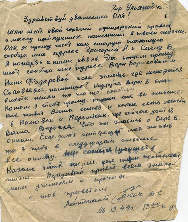 Письмо Егоровой Ольге Григорьевне от лейтенанта Ткача В.С. 26.12.1944 г.