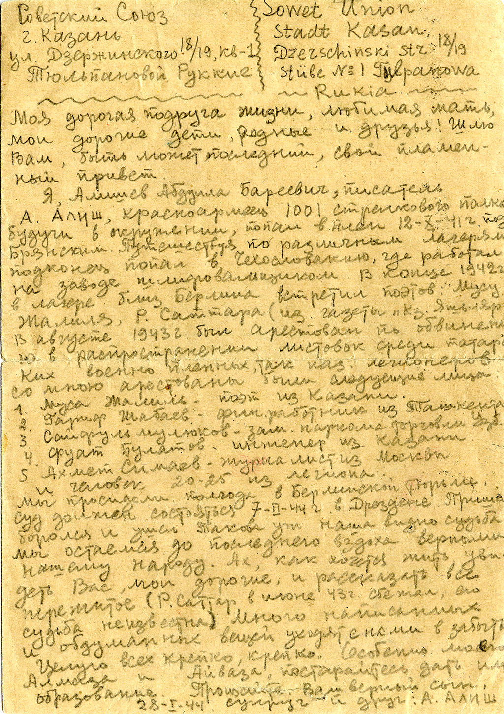 Последнее письмо А. Алишева жене и детям. 28 января 1944 года