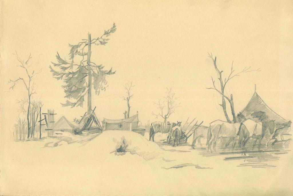 Альменов Б.М. Полевой госпиталь. 1944 г. Бумага, карандаш.