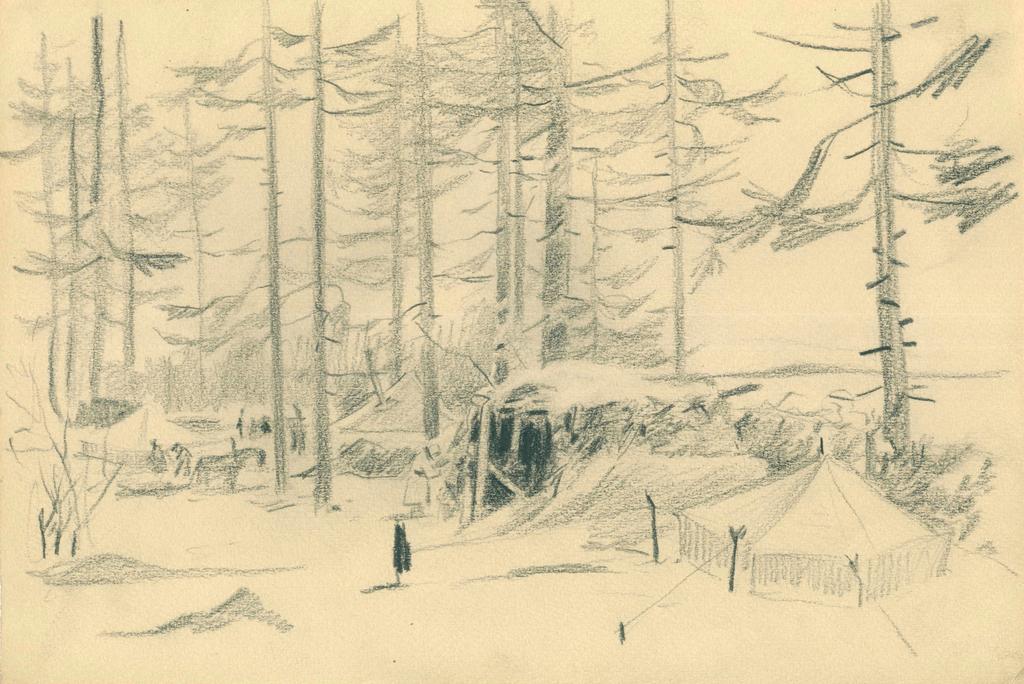 Альменов Б.М. Лагерь в лесу. 1944 г. Бумага, карандаш.