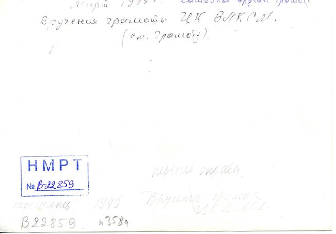 Фотография (оборотная сторона). Вручение грамоты ЦК ВЛКСМ Ахтямову С.А. Март 1945 г.