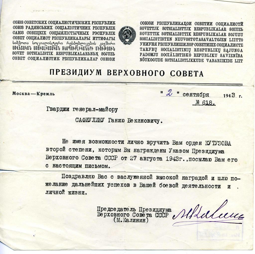 Письмо о вручении ордена Кутузова II степени генерал-майору Сафиуллину Г.Б. СССР. 2 сентября 1943