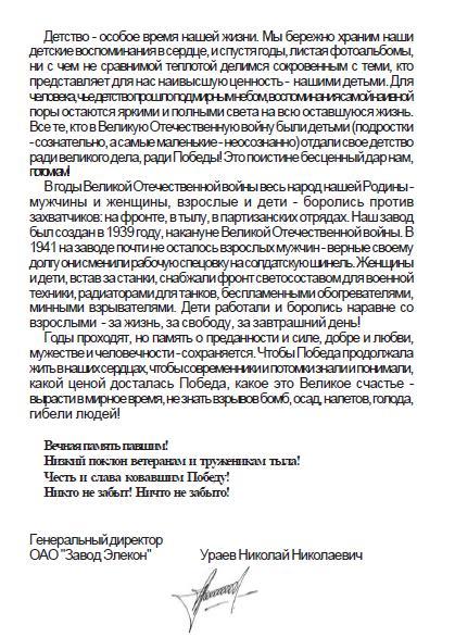 Коллектив ОАО "Завод Элекон" в год 70-летия Великой Победы выпустил Книгу воспоминаний детей войны. Эта книга «Дети войны. Воспоминания элеконовцев» содержит авторские статьи работников и ветеранов казанского седьмого завода, в настоящее время именуемого ОАО «Завод Элекон», детство которых пришлось на годы Великой Отечественной войны. Статьи посвящены воспоминаниям о жизни в военное время: труду, семье, отваге, мужеству, стойкости в преодолении испытаний, патриотизму детей, вере в Победу и единству нашего народа в борьбе с фашистским захватчиком. Творческий коллектив, работавший над созданием книги, выражает глубокую признательность всем ветеранам Великой Отечественной войны, труженикам тыла и огромную благодарность всем авторам, принявшим участие в создании книги.