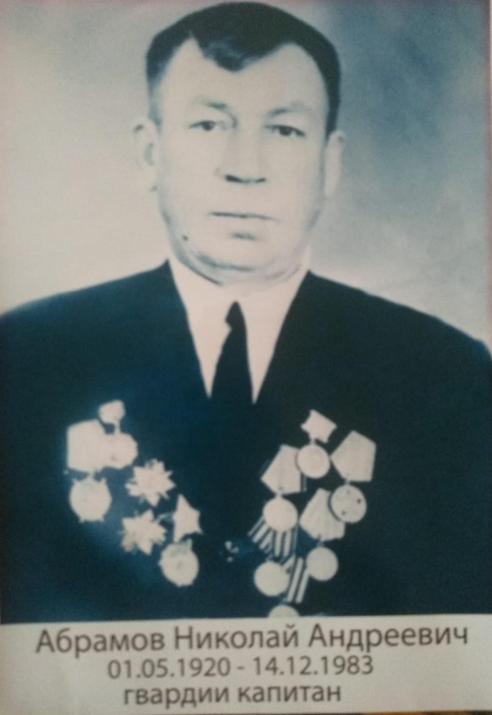 Родился Николай Абрамов в Зеленовке Тетюшского района 1 мая 1920 года, в 1939 году женился на односельчанке Евдокии, в ноябре 1940 года его призвали в ряды Красной армии на срочную службу, в этот же год появился в семье первый сын – Владимир. Пройдя всю войну, Победу Николай Андреевич встретил в Кенигсберге. После этого год еще служил, демобилизовался, вернулся в родные края. В Тетюшах устроился работать в «Сельхозтехнику», параллельно получил инженерное образование. Шесть лет был директором «Сельхозтехники» в Больших Тарханах, затем – в Тетюшах председателем Межколхозной строительной организации, вышел на заслуженный отдых с механического завода. Жена работала в детском саду, на механическом заводе. У супругов родилось двое сыновей.