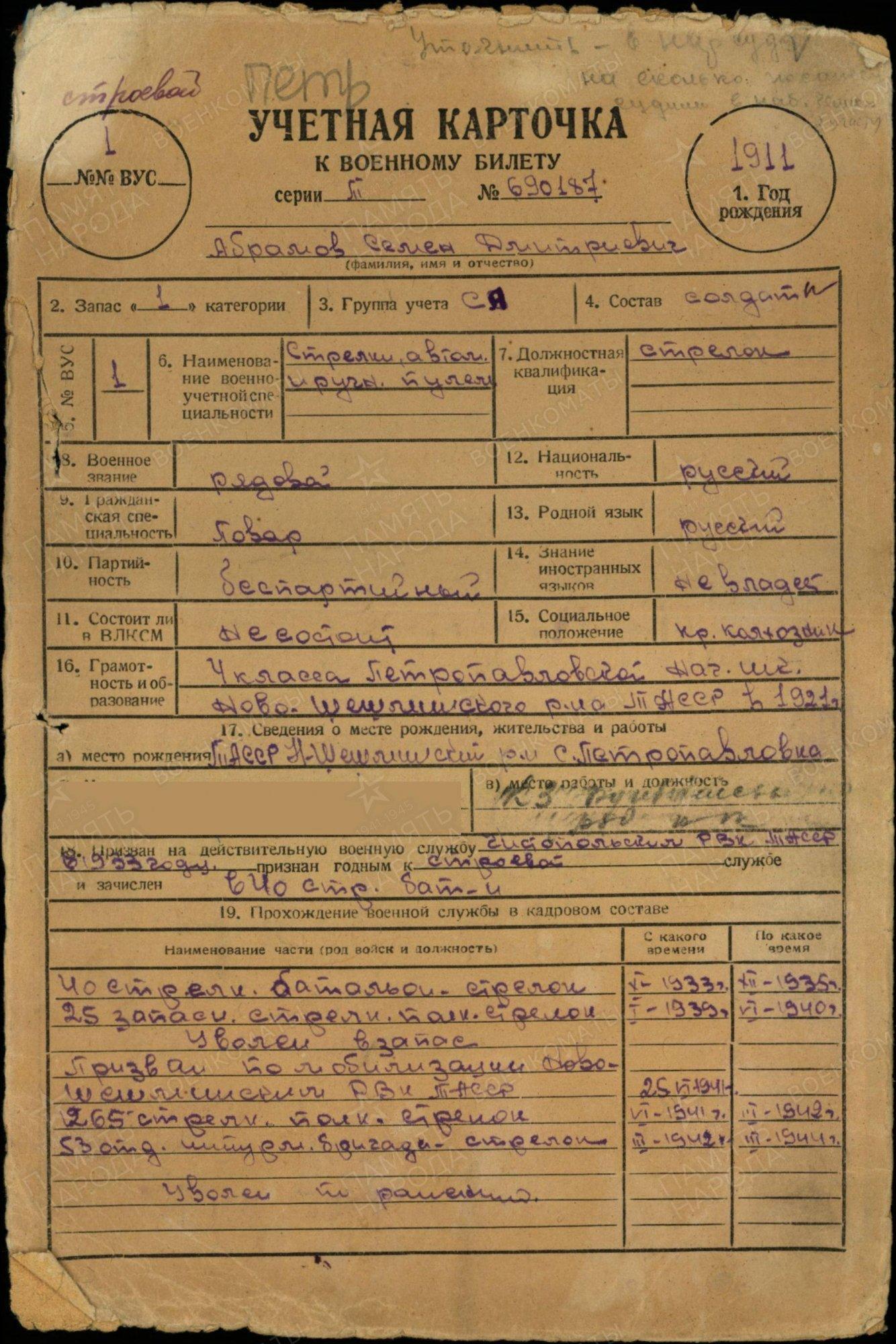 Абрамов Семен Дмитриевич родился в 1911 году в с.Слобода Петропавловская Казанской губернии Чистопольского уезда Новошешминской волости. Мобилизовался Новошешминским РВК в 1941 году, стрелок 265 сп, 53 обр. Демобилизовался в 1944 году. После войны работал в колхозе им.Куйбышева, зоотехником. Похоронен на сельском кладбище с.Слобода Петропавловская.
