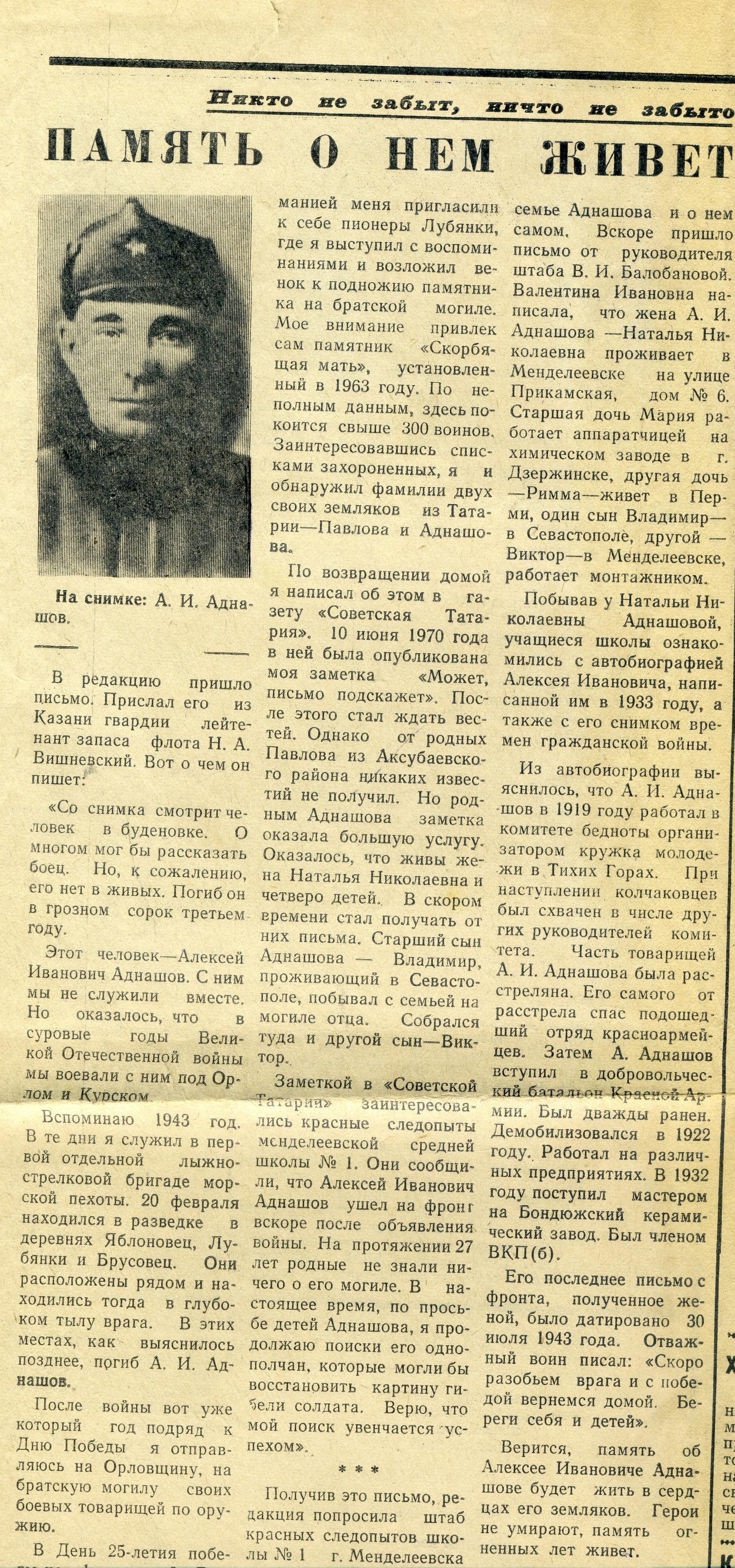 Долгие годы о месте захоронения А.Аднашова родные не знали, пока в газете не была опубликована заметка фронтовика Н.Вишневского из Казани. Он также участвовал в Курской битве и часто ездил на места боев. В селе Лубянки Орловской области на мемориале он нашел имена двух земляков Павлова из Аксубаевского района и Аднашова из Тихих Гор. На его письмо откликнулись красные следопыты Менделеевской средней школы №1. Они разыскали жену А.Аднашова Наталью Николаевну, собрали биографические сведения о фронтовике, его фото. Дети посетили могилу отца.