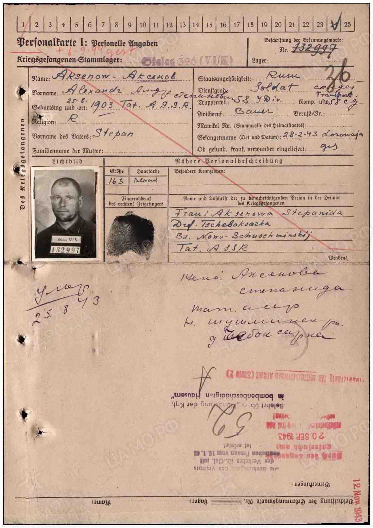 Аксенов Александр Степанович родился в 1903 году в с.Чебоксарка Новошешминский р-н,кр-ц,58 сд, у/п 25.08.43 г., Погиб в плену 06.09.1944 года. Место захоронения: Германия, г.Шлосс Хольте-Штукенброк,шталаг VI K(326)(в плен:28.2.43:Лозовая). Арх.КГБ 13461, 977520, 2919.
