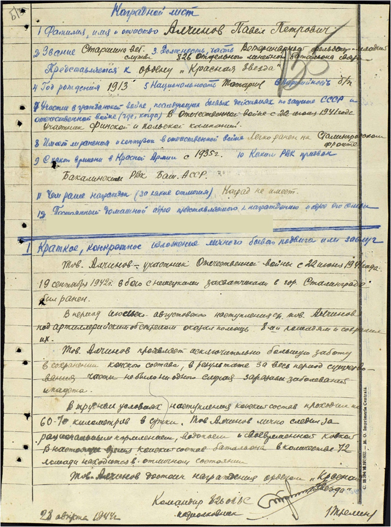 Из старого документа узнаю, что прадедушка под артиллерийским обстрелом, рискуя жизнью, оказал помощь восьми лошадям и сохранил им жизнь. А ведь лошадь на войне облегчала жизнь солдатам (возила боеприпасы, раненых бойцов, продукты, воду). Написано: «Товарищ Алчинов проявляет исключительно большую заботу о сохранении конского состава. В результате, за весь период существования части не было ни одного случая заражения или заболевания лошадей. В трудных условиях наступления конский состав проходил 60-70 километров в сутки. Товарищ Алчинов лично следил за рациональным кормлением, водопоем и своевременной ковкой. В настоящее время конский состав батальона в количестве семидесяти двух лошадей находится в отличном состоянии».