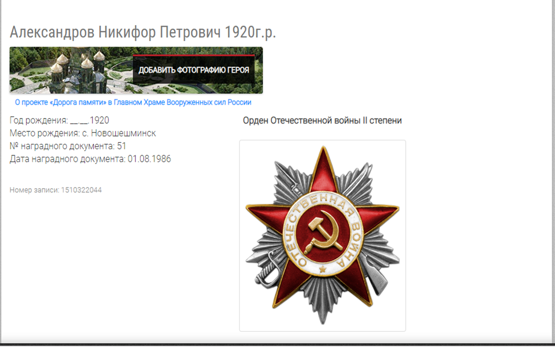 АЛЕКСАНДРОВ Никифор Петрович родился в 1920 году в село Русское Азелеево Зеленодольского района. Моб. в 1941 г. Новошешминским РВК, стрелок, 25 об. Место раб.: МТС, тракторист. Умер в 1992 г., похоронен на сельском кладбище с.Новошешминск.